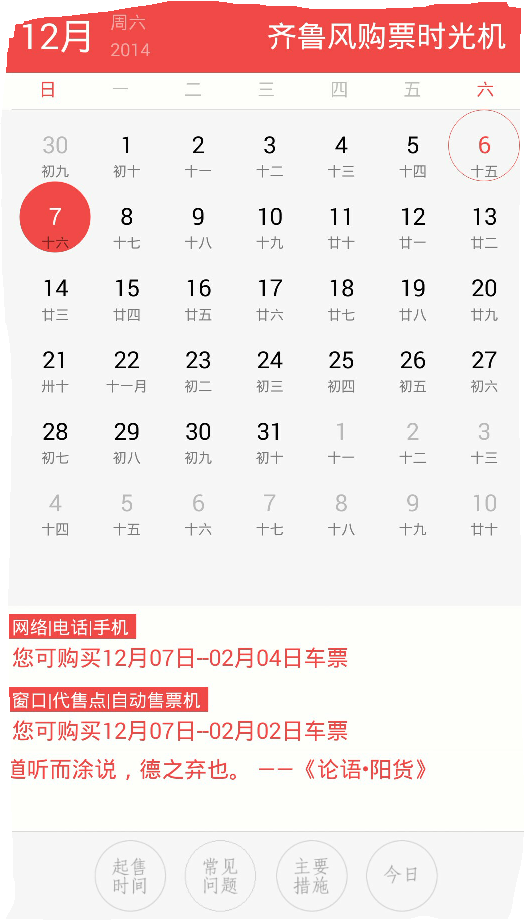 記者下載“齊魯風(fēng)購(gòu)票時(shí)光機(jī)”手機(jī)客戶端后發(fā)現(xiàn),通過點(diǎn)擊日期,可以隨時(shí)查到當(dāng)天可以通過網(wǎng)絡(luò)、電話、手機(jī)購(gòu)買車票的票面日期及車站窗口、代售點(diǎn)購(gòu)買車票的票面日期。據(jù)悉,“齊魯風(fēng)購(gòu)票時(shí)光機(jī)”手機(jī)客戶端主要為旅客提供詳細(xì)的購(gòu)票時(shí)間全方位的運(yùn)輸資訊。包含車票起售時(shí)間、常見問題、主要措施及儒家文化推送等內(nèi)容。“起售時(shí)間”詳細(xì)介紹了濟(jì)南局各站每天梯次起售車票的時(shí)間及全路主要車站的起售時(shí)間;“常見問題”版塊詳細(xì)介紹了互聯(lián)網(wǎng)售票、電話售票等相關(guān)售票方式和操作方式;“主要措施”版塊詳細(xì)介紹了學(xué)生票、農(nóng)民工團(tuán)體票等特定群體的辦理方式和流程。除此之外,該客戶端還融合了儒家文化宣傳,讓旅客享受儒風(fēng)浸潤(rùn)。