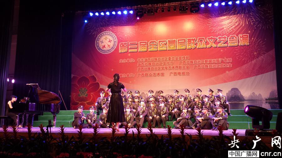 央廣網(wǎng)南寧12月29日消息(記者 鄧君洋 許大為 通訊員 謝中國)群眾會(huì)演喜迎盛會(huì),八桂大地又唱?dú)g歌。為深入貫徹落實(shí)習(xí)近平總書記在文藝座談會(huì)上的重要講話精神,堅(jiān)持以人民為中心的創(chuàng)作導(dǎo)向,大力弘揚(yáng)社會(huì)主義核心價(jià)值觀,廣西自治區(qū)黨委宣傳部、自治區(qū)文化廳、自治區(qū)新聞出版廣電局、自治區(qū)文聯(lián)、自治區(qū)總工會(huì)于12月25日至29日在南寧聯(lián)合主辦第三屆全區(qū)基層群眾文藝會(huì)演。本屆會(huì)演以“中國夢”為主題,充分展現(xiàn)我區(qū)人民群眾的時(shí)代精神風(fēng)貌。