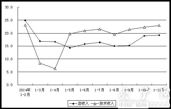 2014年1-11月中關村示范區(qū)總收入及技術收入增速圖 北京市統(tǒng)計局供圖 (央廣網(wǎng)記者 李文蕊 攝)