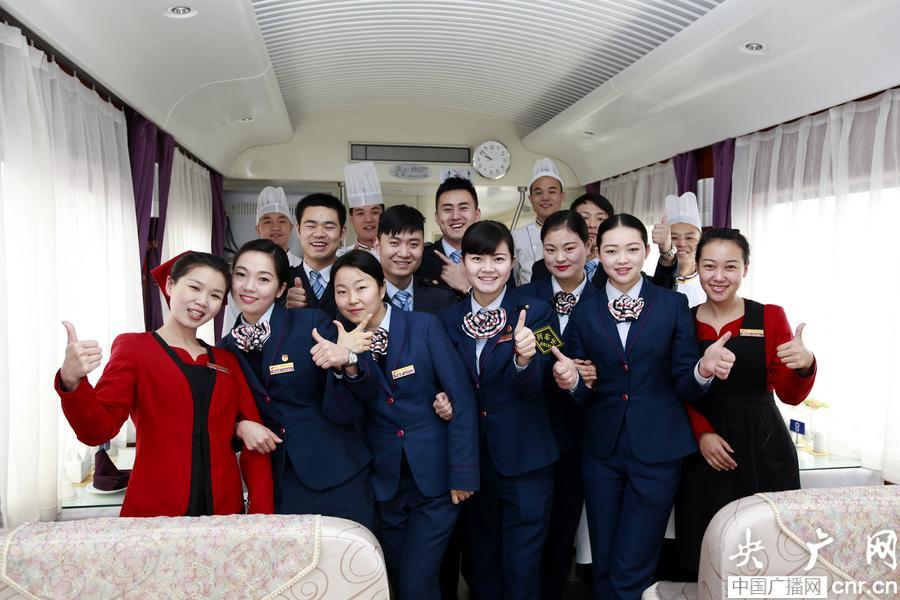 1月30日列車(chē)始發(fā)前,成都客運(yùn)段Z50次九組列車(chē)工作人員以良好的精神面貌迎接2015年春運(yùn)的到來(lái)。(央廣網(wǎng)發(fā) 胡志強(qiáng)攝)