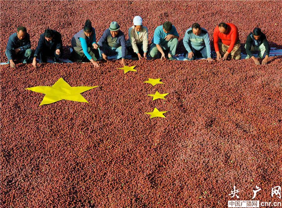 新疆棗農(nóng)用紅棗拼國旗(資料照片)(央廣網(wǎng)記者 張雷 攝)