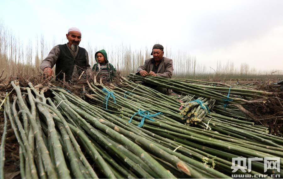新疆焉耆農(nóng)民道不代十分失落地在地里扎捆苗木(央廣網(wǎng)發(fā) 董基春 攝)