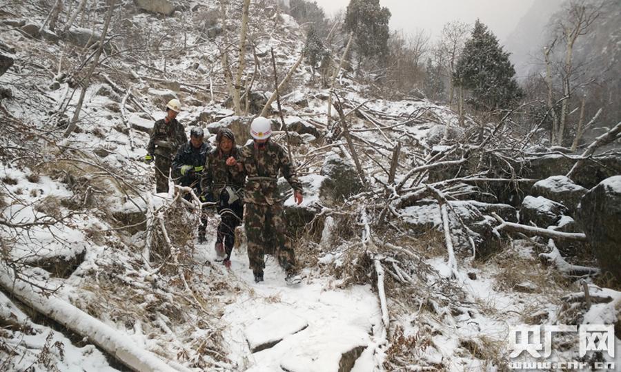 晚上10時(shí)多消防官兵抵達(dá)滾鐘口賀蘭石礦山腳下,通過詢問得知,被困人員位置較遠(yuǎn),山路崎嶇。由兩名景區(qū)巡山人員領(lǐng)路,救援官兵深入山中進(jìn)行救援,并分成兩組進(jìn)行找尋。但由于深夜無法確定被困人員位置, 今日凌晨,7名救援官兵攜帶救援器材再次與巡山人員進(jìn)山救援。上午11時(shí)確定被困者位置,12時(shí)找到了被困十多個(gè)小時(shí)的兩名被困人員。在下山的途中突然下起了大雪,山路被雪覆蓋,在利用安全繩互相牽引下試探一點(diǎn)一點(diǎn)往山下撤離。經(jīng)過連續(xù)8個(gè)多小時(shí)的艱苦救援,下午2時(shí)40分,兩名被困人員被成功救下山,身體并無大礙。