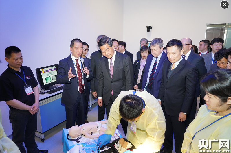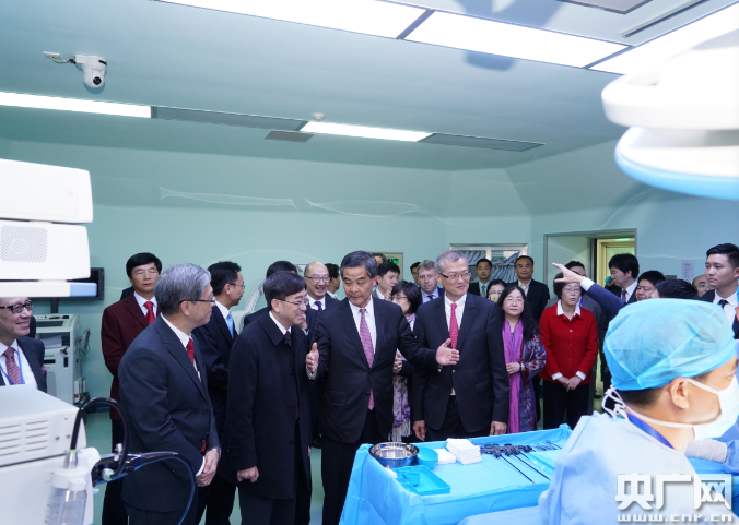 活動(dòng)儀式后,梁振英在吳以環(huán)副市長(zhǎng)和廣東省港澳辦公室主任廖京山陪同下參加了醫(yī)院,并仔細(xì)觀摩了在臨床技能模擬培訓(xùn)中心開(kāi)展的高級(jí)創(chuàng)傷生命支持(ATLS@)訓(xùn)練課程、中醫(yī)針灸推拿治療應(yīng)用中草藥配合針灸、推拿、拔罐、艾灸等傳統(tǒng)治療方法治療等過(guò)程,并參觀了醫(yī)院藥房自動(dòng)配藥裝置和藥品管理系統(tǒng)、醫(yī)院手術(shù)室二區(qū)達(dá)芬奇機(jī)器人手術(shù)間和兒科病區(qū)。他對(duì)港大深圳醫(yī)院優(yōu)美的環(huán)境和先進(jìn)設(shè)施表示贊賞,稱(chēng)贊醫(yī)療服務(wù)和管理“達(dá)到國(guó)際化水平”。