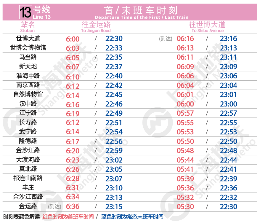 另外,針對(duì)網(wǎng)友反映的13號(hào)線末班車時(shí)間結(jié)束較早的問題,地鐵運(yùn)營(yíng)方也是高度重視。5月27起,13號(hào)線延長(zhǎng)了全天運(yùn)營(yíng)時(shí)間,根據(jù)計(jì)劃:?jiǎn)⒂眯铝熊囘\(yùn)行圖后,13號(hào)線金運(yùn)路站的首末班車時(shí)間由原先的5:50和22:11,調(diào)整為5:30和22:30,調(diào)整后金運(yùn)路往世博大道方向全天運(yùn)營(yíng)時(shí)間增加39分鐘;而13號(hào)線世博大道站的首班車時(shí)間維持在6:00不變,末班車時(shí)間由原先的22:08調(diào)整為22:30,調(diào)整后世博大道往金運(yùn)路方向全天運(yùn)營(yíng)時(shí)間增加了22分鐘。