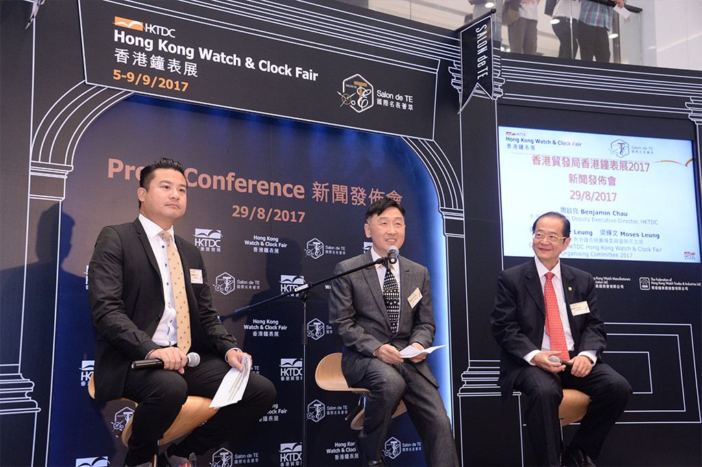 香港表廠商會(huì)副會(huì)長(zhǎng)梁嘉威(左) 、香港貿(mào)發(fā)局副總裁周啟良(中)及香港鐘表業(yè)總會(huì)會(huì)董梁輝文(右),在新聞發(fā)布會(huì)上介紹展會(huì)特色及香港鐘表業(yè)的最新發(fā)展。