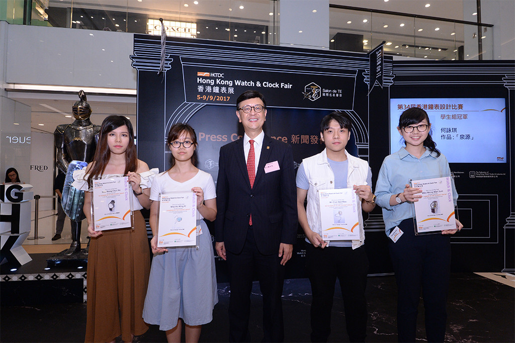 香港鐘表業(yè)總會(huì)主席孫大豪(中)與香港鐘表設(shè)計(jì)比賽學(xué)生組得奬者合照。