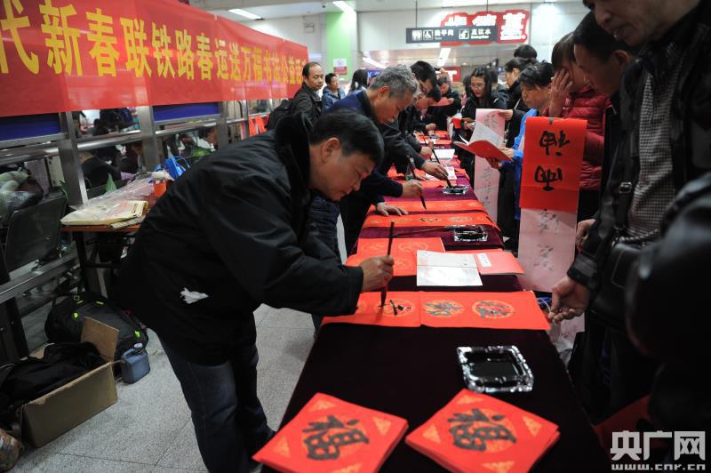 據(jù)深圳車站黨委辦公室負(fù)責(zé)人介紹,本次主題活動既是廣鐵“新時代新春聯(lián)鐵路春運(yùn)送萬福書法公益活動”的現(xiàn)場之一,也是車站“美好旅途,帶;丶摇钡膫鹘y(tǒng)活動現(xiàn)場!懊篮寐猛,帶;丶摇贝哼\(yùn)送溫暖活動已經(jīng)開展了三年。今年的快閃參與人員全部是到站服務(wù)的志愿者、義工,他們有來自深圳職業(yè)技術(shù)學(xué)院的大學(xué)生志愿者,還有羅湖區(qū)南湖街道辦義工聯(lián)及民樂志愿者協(xié)會的義工。志愿者們的最大心愿,是希望把深圳這座城市的愛和溫暖帶給千家萬戶!靶聲r代新春聯(lián)鐵路春運(yùn)送萬福書法公益活動”則是廣鐵集團(tuán)文聯(lián)圍繞鐵總2018年“平安春運(yùn)、有序春運(yùn)、溫馨春運(yùn),讓旅客體驗(yàn)更美好”的目標(biāo),組織多名書法藝術(shù)家,深入粵湘瓊鐵路站區(qū),開展為旅客寫春聯(lián)、送祝;顒。他們從1月27日開始,已連續(xù)在汨羅站、惠州站、廣州站、深圳北站等7個站段及廣鐵集團(tuán)扶貧點(diǎn)——化州市中垌鎮(zhèn)公居村,為旅客和鐵路職工及村民義務(wù)書寫春聯(lián),送去祝福。