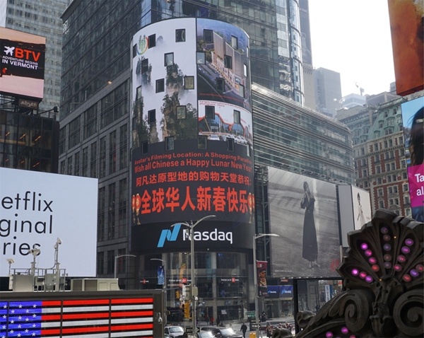 央廣網(wǎng)長沙2月18日消息(記者鄧文輝 通訊員王建軍)紐約當(dāng)?shù)貢r間2月15日,美國紐約時代廣場的納斯達(dá)克大屏幕,滾動播出中英文祝福的宣傳片:“阿凡達(dá)原型地的購物天堂恭祝全球華人新春快樂!”宣傳片上展示了中國著名風(fēng)景區(qū)張家界的獨特峰林,以及將在今年建成運營的張家界豐澤國際公共保稅倉、東方曼哈頓全球保稅直購中心。