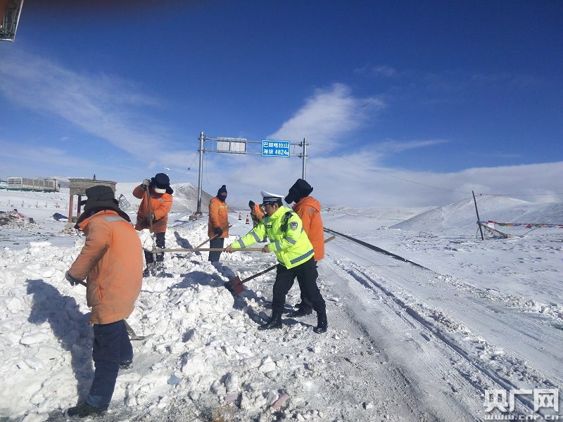 交警和道路養(yǎng)護(hù)部門聯(lián)合清理路面積雪 央廣網(wǎng)發(fā) 瑪多交警供圖