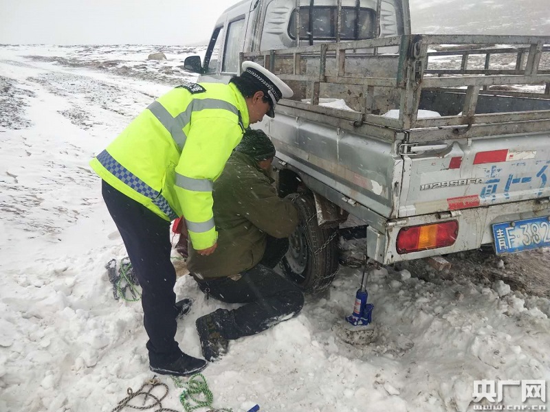 交警幫助被困司機(jī)安裝防滑鏈 央廣網(wǎng)發(fā) 瑪多交警供圖