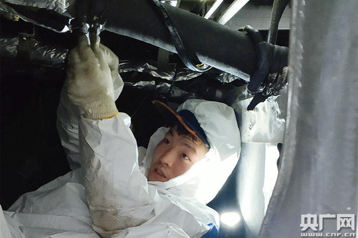央廣網(wǎng)重慶1月30日消息(記者趙聰聰 通訊員施為 倪瑜浩)“別都圍上來,他不好出來!薄奥c!別磕著!”“來!扶一把!”“別動!稍等!我腿麻了得緩緩......”1月30日,成都動車段檢修庫動車組內(nèi),二級修4班王占軍穿著污跡不堪的白色的防護服滿頭大汗從設備艙鉆出來。