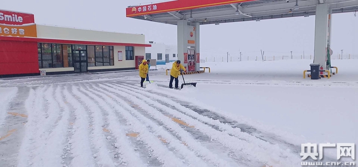 清理加油站內(nèi)積雪(央廣網(wǎng)發(fā) 圖片由中國石油青海銷售公司提供)
