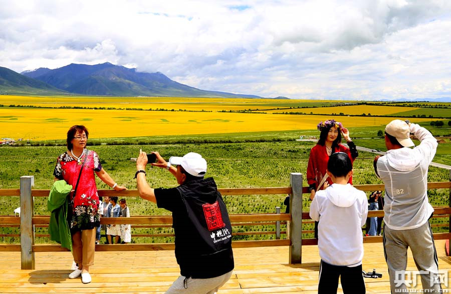 游客在門源百里油菜花海景區(qū)拍照(央廣網記者 張雷 攝)