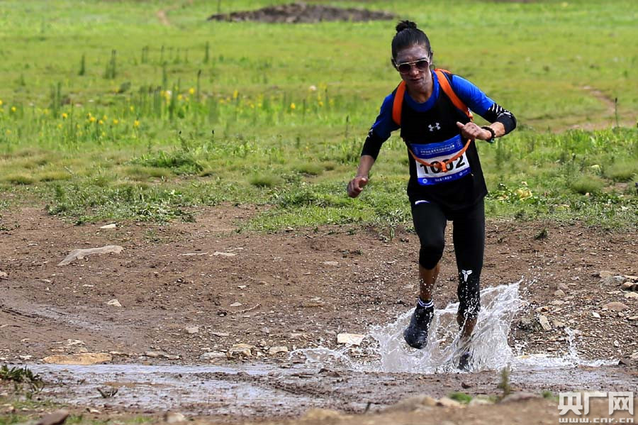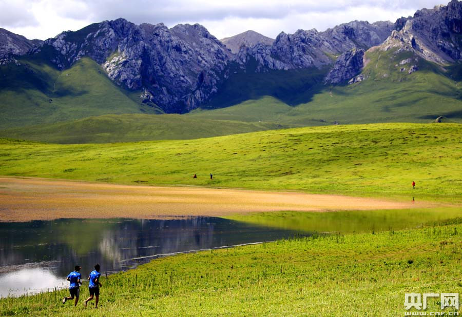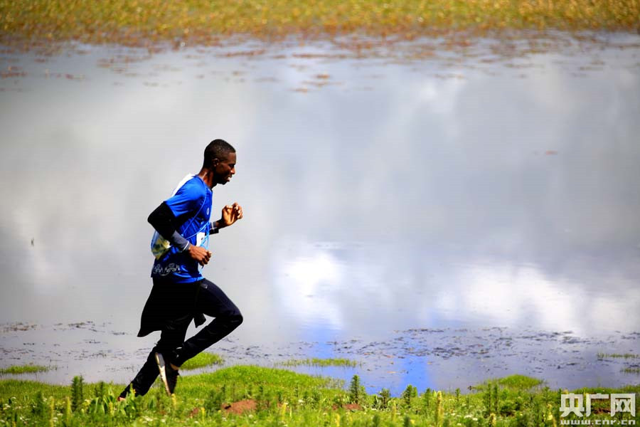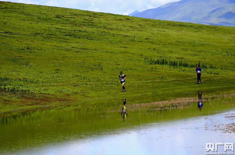 外國(guó)選手跑過美麗的草甸湖泊(央廣網(wǎng)記者 張雷 攝)