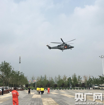 直升機災(zāi)難中救援傷員演示。(央廣網(wǎng)見習記者 張曉琳 攝)