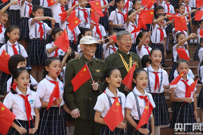 盡管年事已高、步履緩慢,但他們依然精神抖擻地站在隊(duì)伍里。鮮艷的五星紅旗冉冉升起,兩位老兵激動(dòng)地舉手敬禮,飽經(jīng)風(fēng)霜的臉上,洋溢著勝利的豪情。