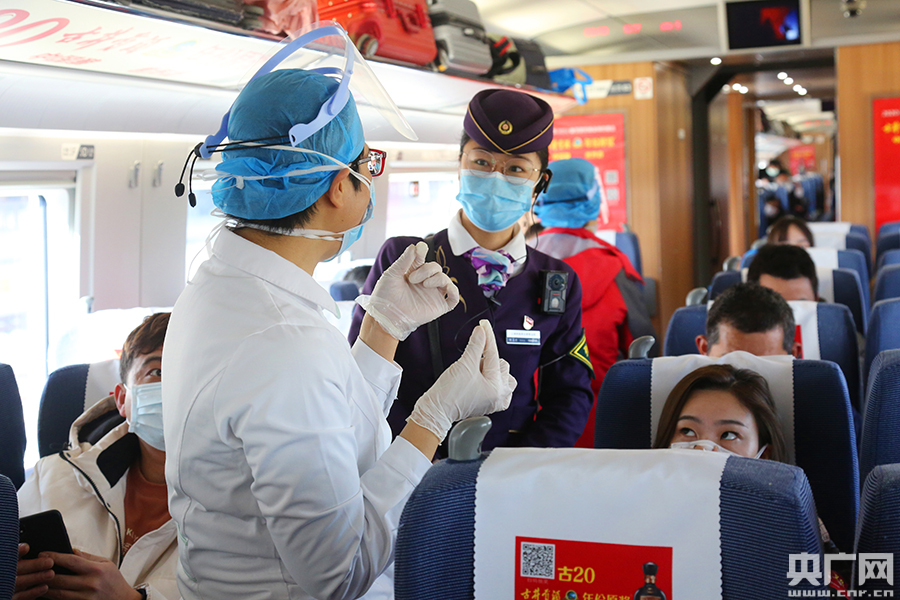 乘務(wù)員和醫(yī)療人員向旅客宣傳防疫知識(央廣網(wǎng)發(fā) 通訊員梁浩然 供圖)