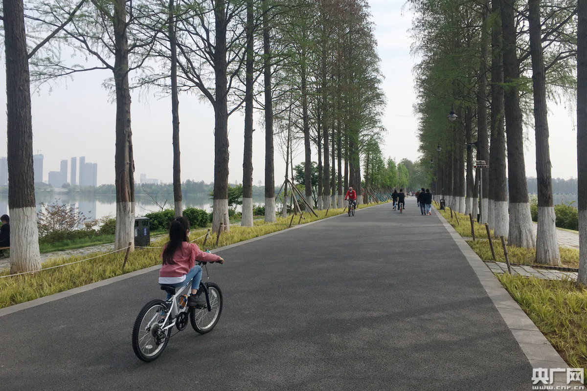 武漢的春天,一定要來東湖綠道走走。4月8日上午,戴著口罩的小女孩在愜意地騎行單車,享受著東湖綠道如畫般的風(fēng)景。(央廣網(wǎng)記者 熊峰 攝)