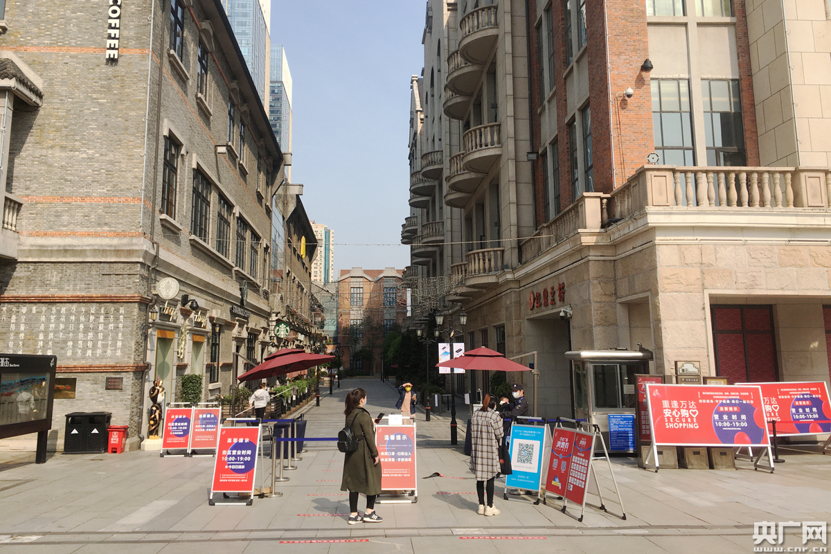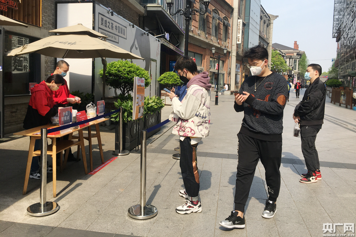 4月8日上午,武漢市楚河漢街商業(yè)步行街入口,市民需要掃碼和檢測體溫正常才能進入購物。(央廣網(wǎng)記者 熊峰 攝)