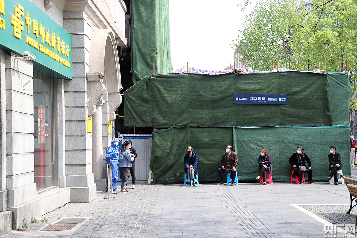 4月8日上午,武漢一郵政儲蓄銀行在大門口處設(shè)置等候區(qū),引導(dǎo)市民保持安全距離排隊辦理業(yè)務(wù)。(央廣網(wǎng)記者 張卓 攝)