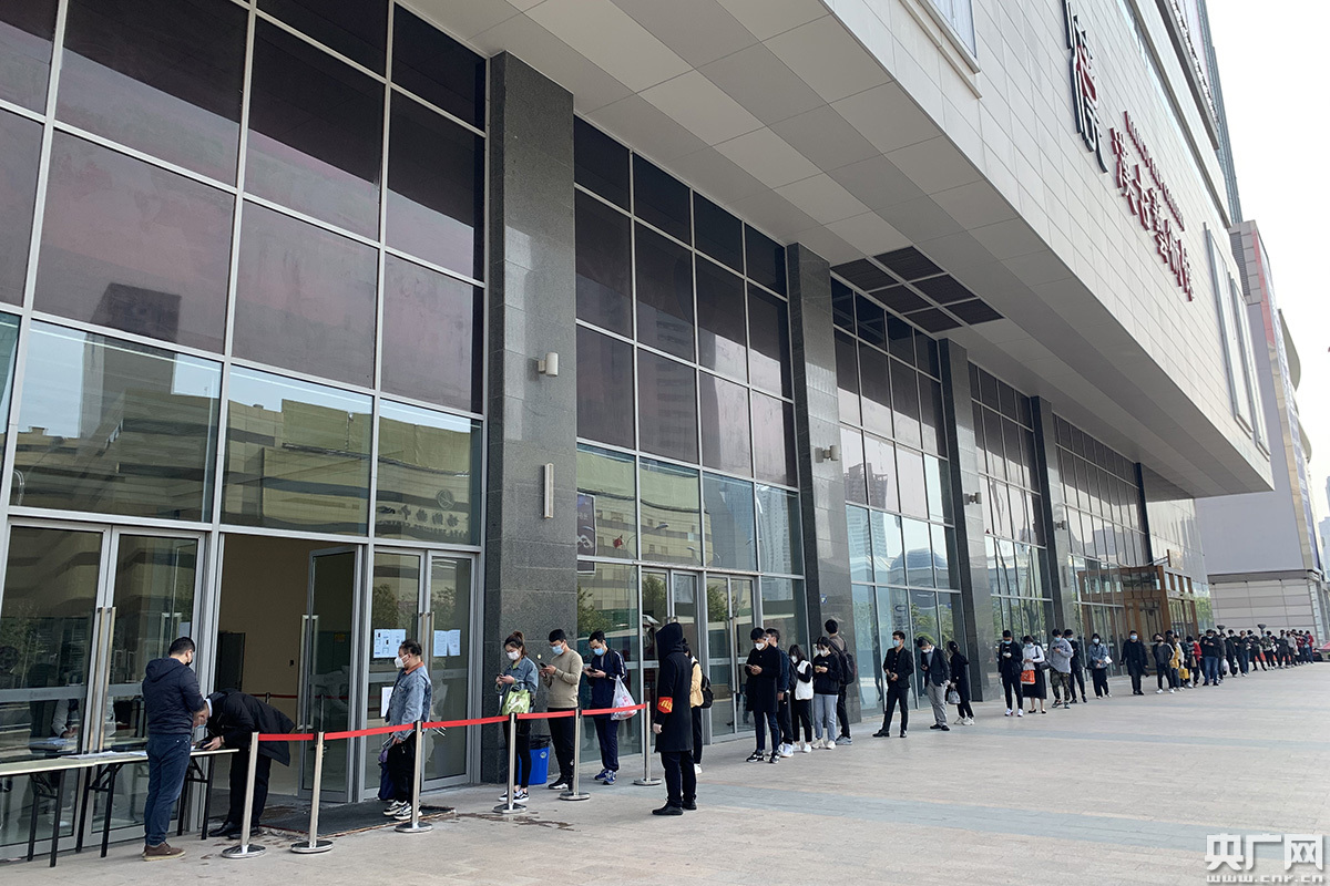 4月8日,在武漢光谷融眾國際大廈,市民正在有序排隊進入寫字樓上班。(央廣網(wǎng)記者 黃炎秋 攝)