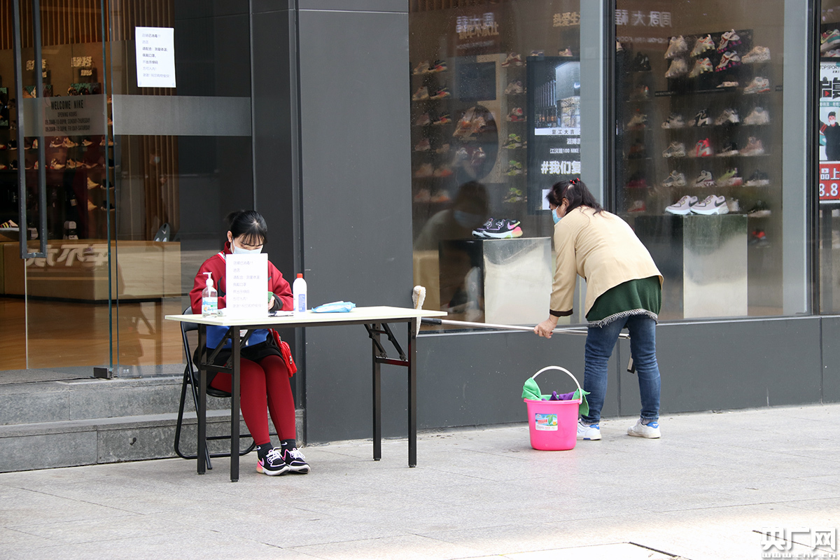 4月8日,武漢某運動品牌專賣店正常營業(yè),門口設(shè)置消毒點,員工正在清潔衛(wèi)生。(央廣網(wǎng)記者 張卓 攝)