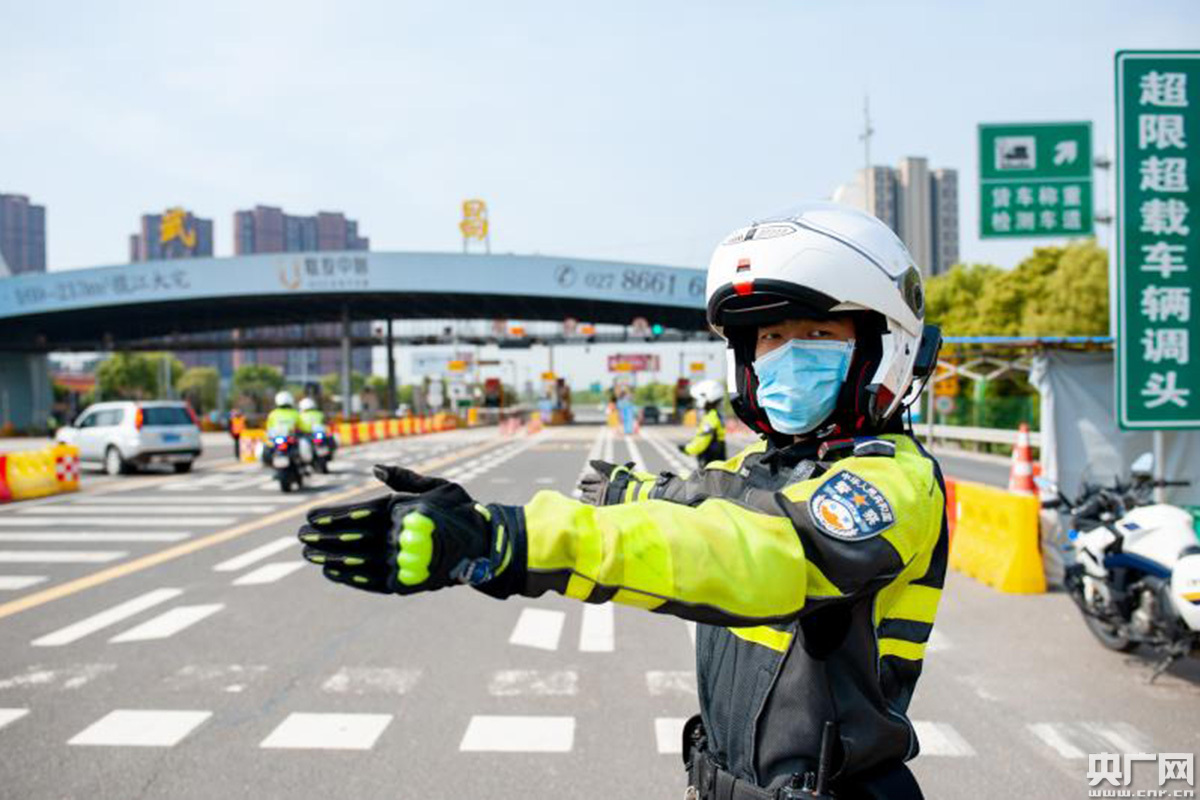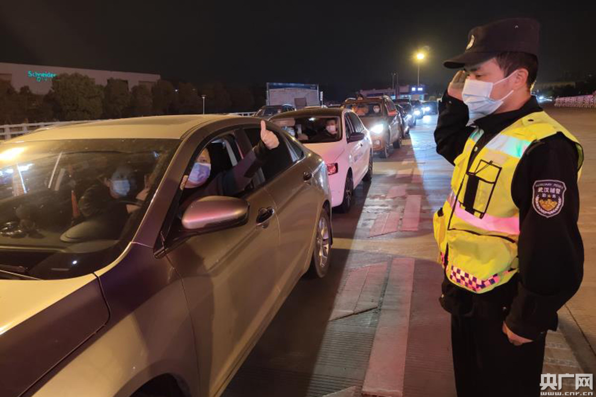 4月8日上午,解封后的武漢青鄭高速武昌收費站。武漢市公安局洪山區(qū)分局張家灣檢查站正在對進城車輛進行治安檢查,洪山區(qū)交通大隊正在疏導(dǎo)出城車輛。(央廣網(wǎng)發(fā) 武漢市公安局供圖)