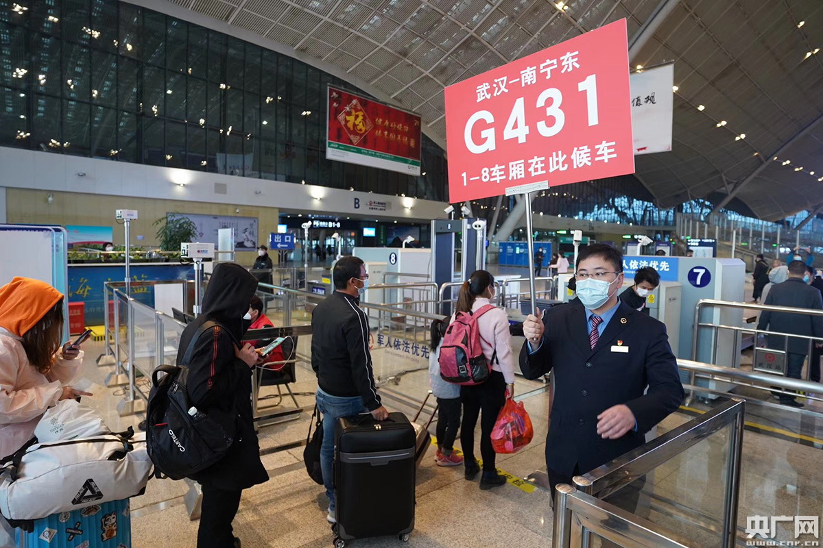 4月8日早上6點50分,從武漢開往南寧東的G431次列車旅客正在排隊候車準備進站,此次列車為解封后武漢站始發(fā)的第一趟列車。(央廣網(wǎng)發(fā) 通訊員王世煒 攝)