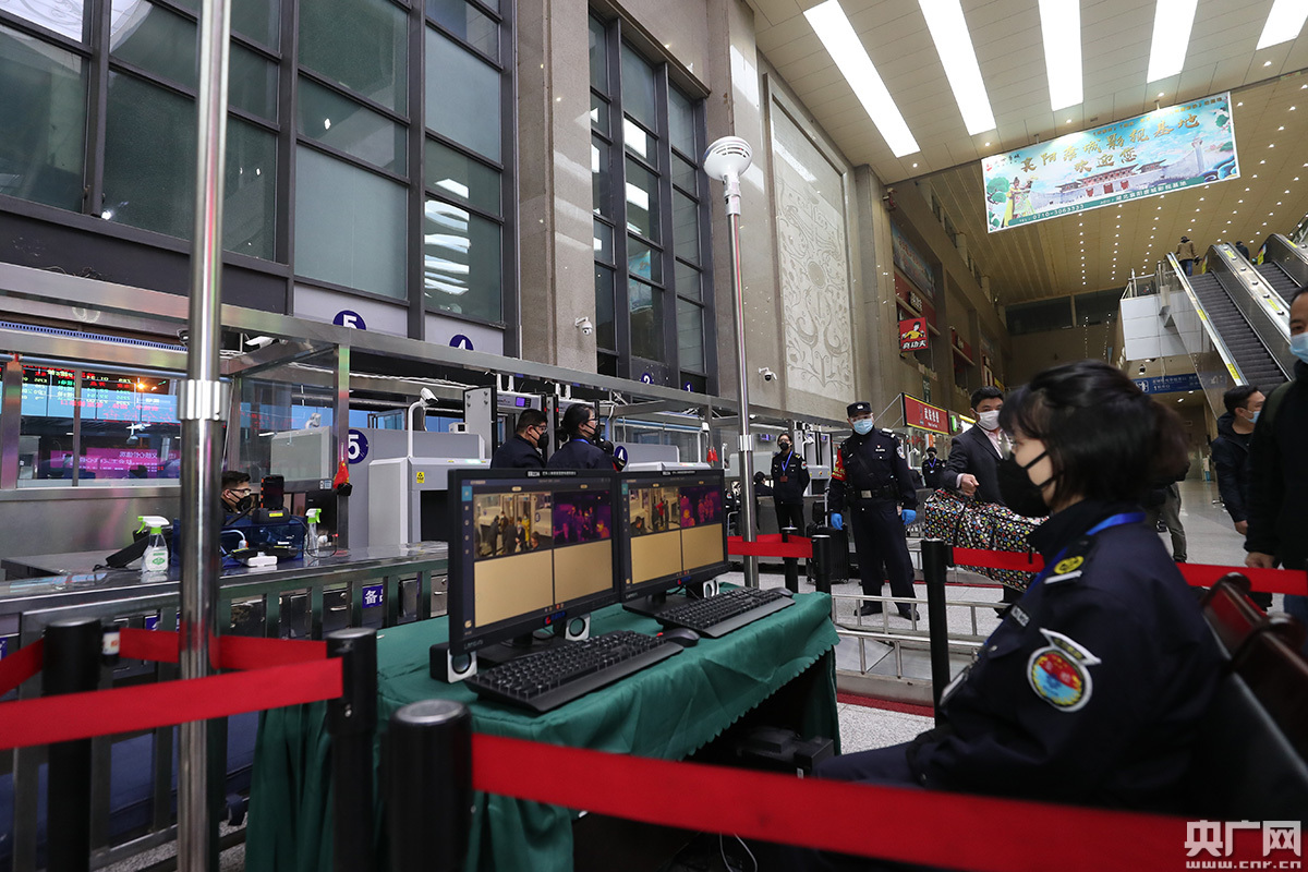 2020年4月8日,武昌火車站,鐵路工作人員正在對乘坐首趟離漢的K81次列車旅客進行紅外體溫監(jiān)測。(央廣網(wǎng)發(fā) 通訊員馮暢 攝)