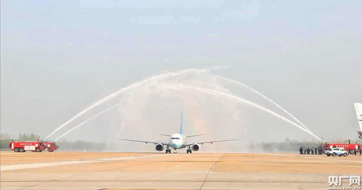4月8日當(dāng)日07:18落地的首個進港航班廈航MF8095(杭州—武漢),武漢天河機場用過水門的方式歡迎。(央廣網(wǎng)發(fā) 武漢天河機場供圖)