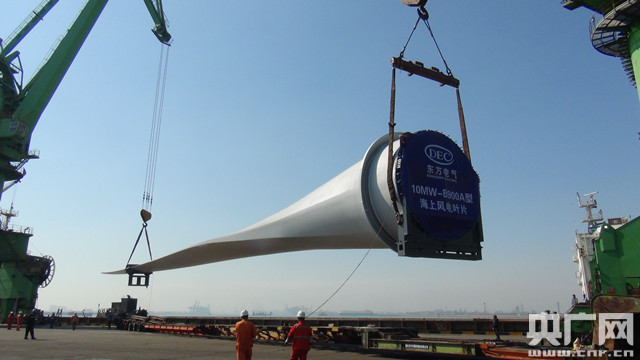 央廣網(wǎng)天津4月27日消息(記者陳慶濱 通訊員杜平喜)記者從天津港獲悉,4月26日,由我國自主研制的國內(nèi)首套10兆瓦海上風(fēng)電葉片,在天津港匯盛碼頭34段平穩(wěn)起吊裝船。三支90米長的巨型葉片,如蛟龍出海,踏浪遠(yuǎn)征,搭載“博潤”輪運往福建水域的興化灣二期風(fēng)電場。