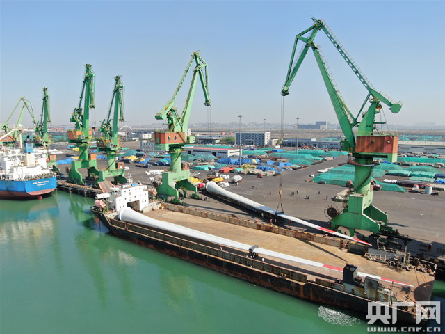 我國首套10兆瓦海上風(fēng)電葉片在天津港順利裝船(央廣網(wǎng)發(fā) 天津港供圖)
