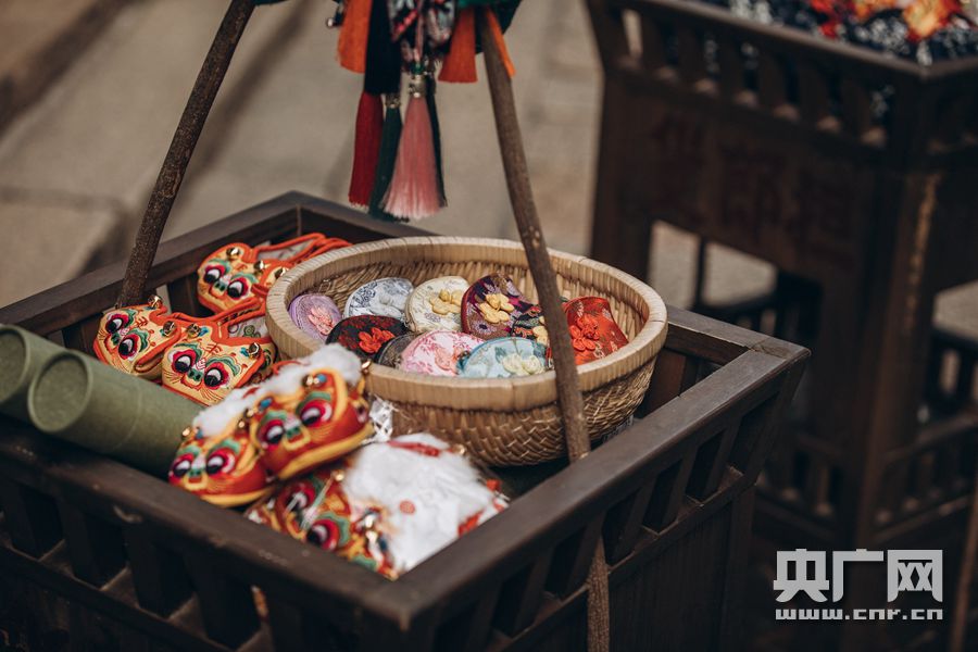 貨郎擔(dān)子中挑著當(dāng)?shù)囟宋缑朗骋约鞍菹隳、虎頭鞋等(央廣網(wǎng)發(fā) 通訊員供圖)