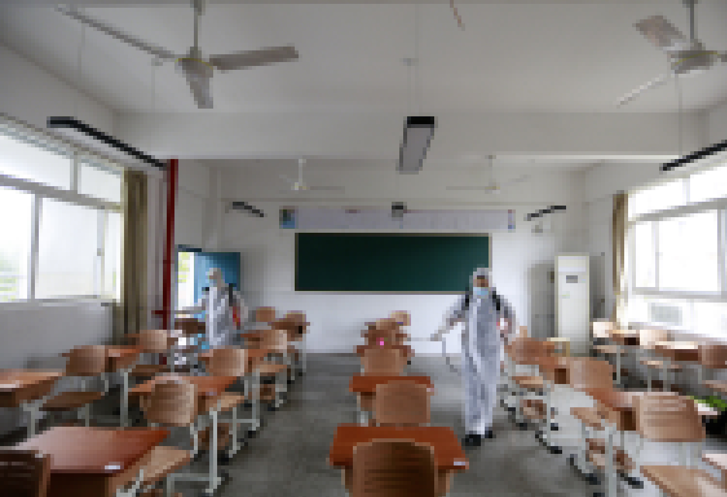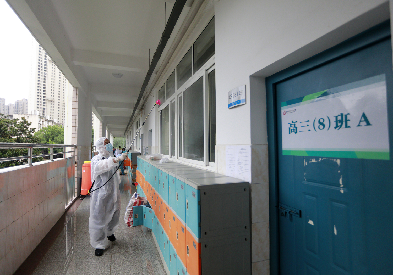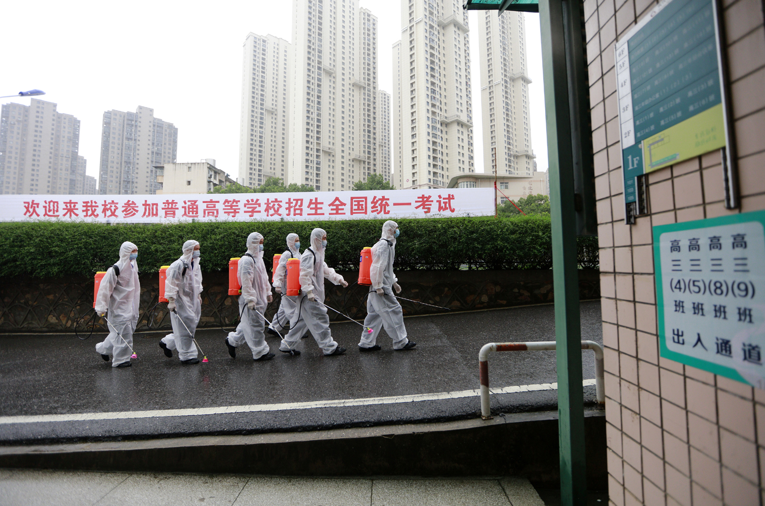 7月5日,在武漢市第二十三中學(xué),消防員正進(jìn)入高考考場(chǎng)開展消殺作業(yè)。央廣網(wǎng)發(fā) 通訊員王方攝