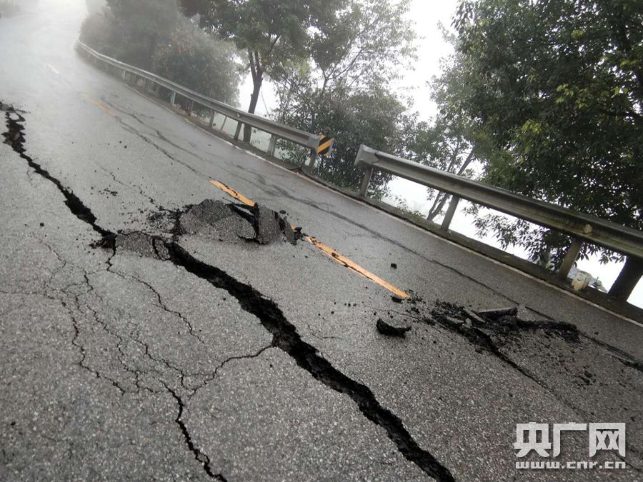 滑坡導(dǎo)致附近大峽谷旅游公路路面開裂(央廣記者 左艾甫 攝)
