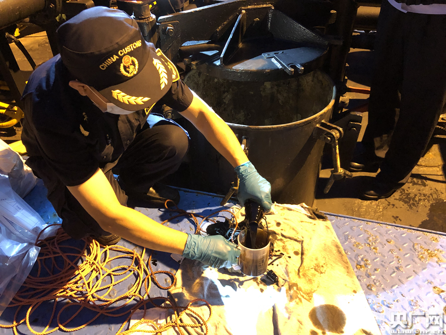 圖為深圳海關工業(yè)品檢測技術中心人員在深圳鹽田港碼頭在油污水卸載船上提取樣品 唐佳偉 攝