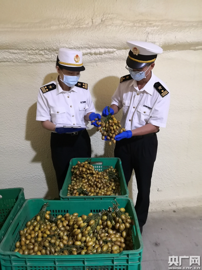 廣州海關(guān)所屬佛山海關(guān)駐高明辦事處關(guān)員對出口黃皮進(jìn)行查驗(央廣網(wǎng)發(fā) 張永瑜 攝)