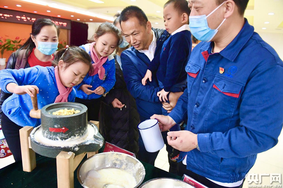 圖為老字號王致和非遺文化進(jìn)社區(qū)公益活動,小朋友在體驗(yàn)腐乳釀造技藝“磨豆”工序。(央廣網(wǎng)發(fā))