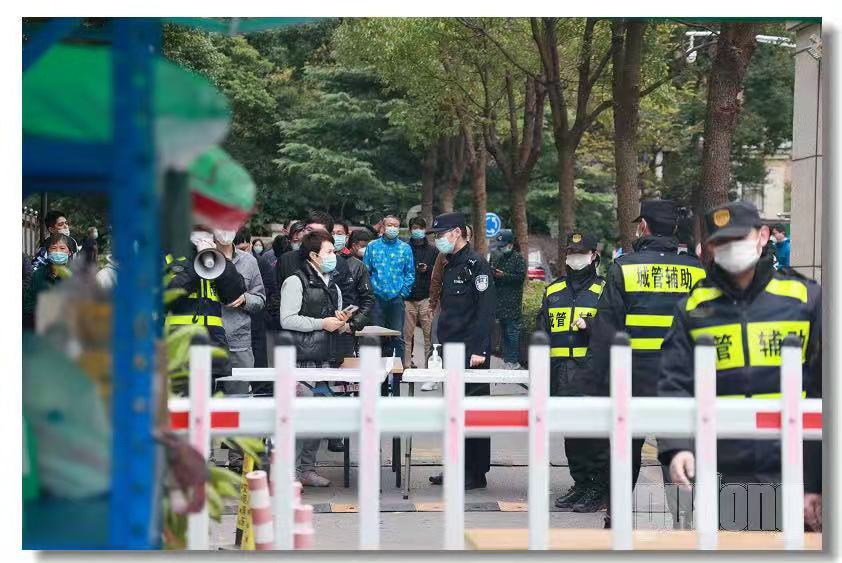 當晚20時,沈維和同事們“全副武裝”做好防護措施后一起趕到小區(qū)內,配合醫(yī)務人員維持臨時檢測點的秩序,同時和居委工作人員一起挨家挨戶通知住戶前去接受檢測。對于發(fā)現(xiàn)病例的52號樓,所有人都敬而遠之,于是沈維和同事主動承擔起了這里居民的核查工作。小區(qū)居民完成檢測已是半夜時分,沈維忙碌了幾個小時仍未停歇,考慮到當天是工作日,部分居民陸續(xù)回家可能還未做檢測,他和同事再次逐棟走訪,一家一家確認檢測情況,這一忙就到了早上8點。