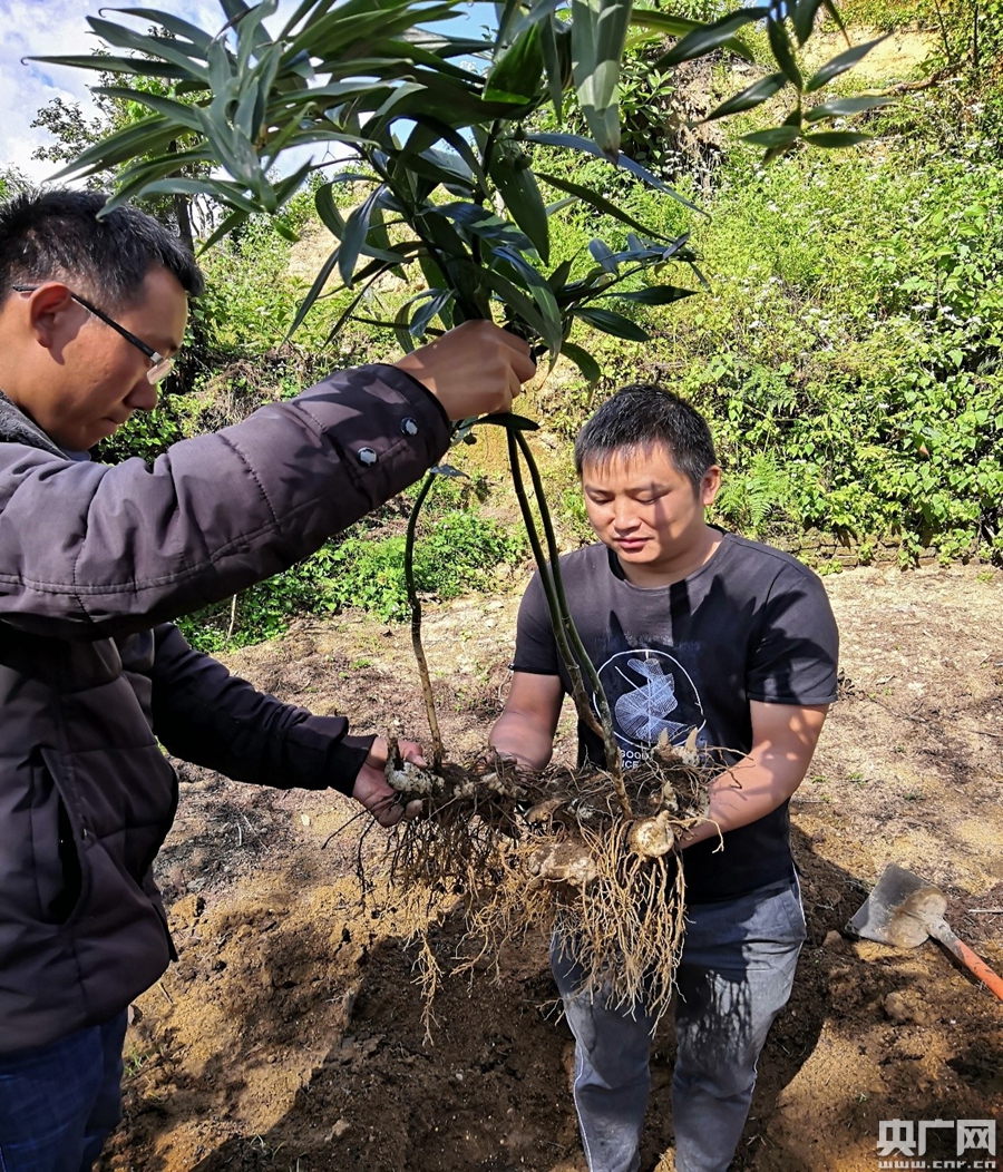 2019年10月2日,紅塘村滇黃精種植專業(yè)合作社社長李茂昌(左)正在取鮮黃精(央廣網(wǎng)發(fā) 張國宇 攝)