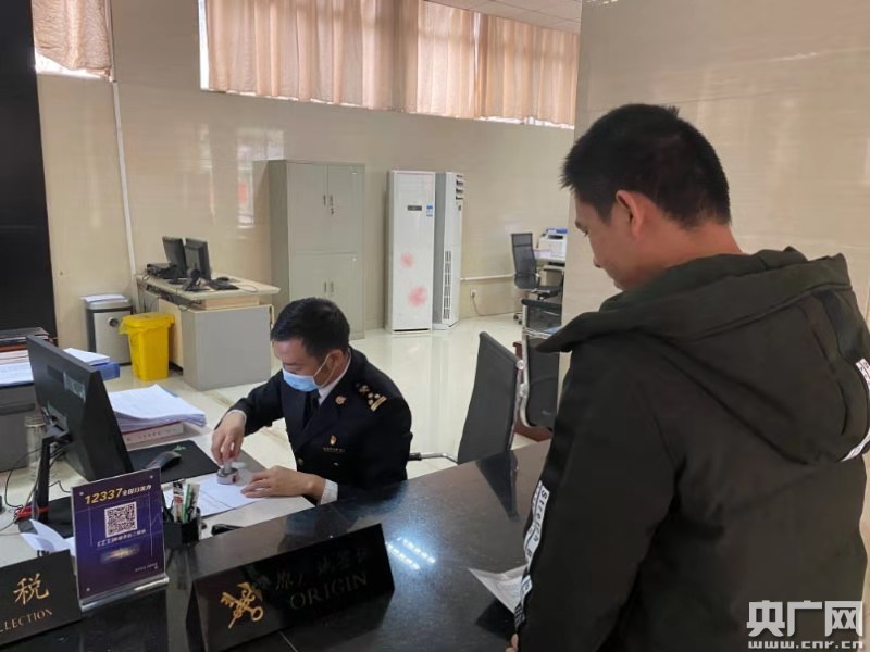 河口海關(guān)關(guān)員對打印完成的原產(chǎn)地證書加蓋印章(央廣網(wǎng)發(fā) 畢然供圖)