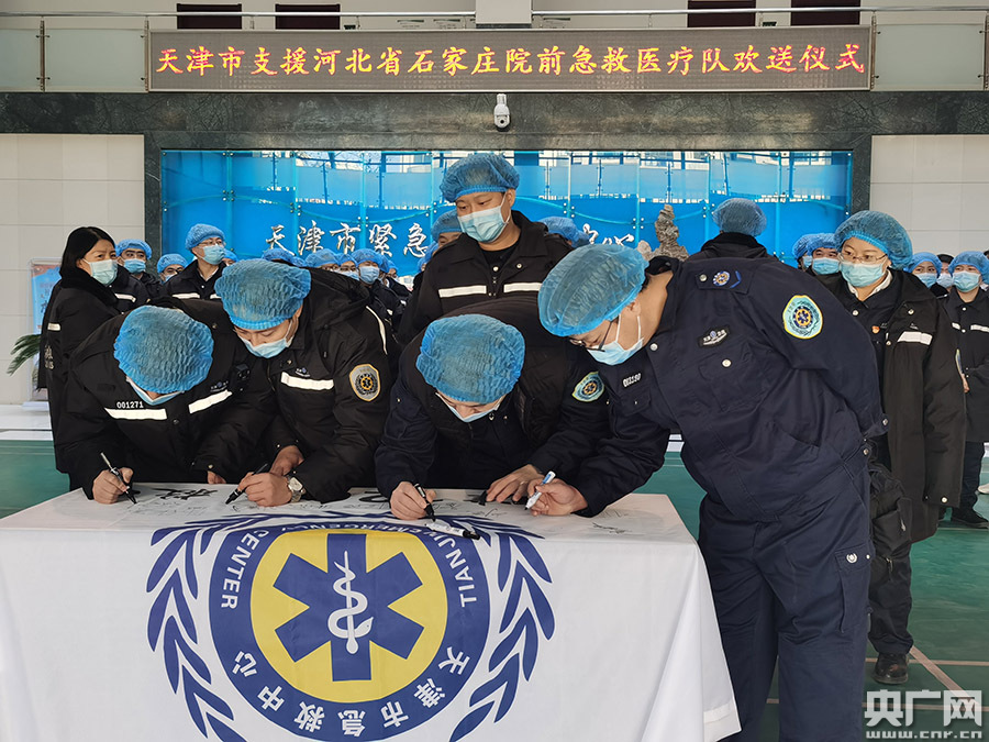 天津市支援河北石家莊院前急救醫(yī)療隊正式啟程(央廣網(wǎng)發(fā) 天津市衛(wèi)健委供圖)