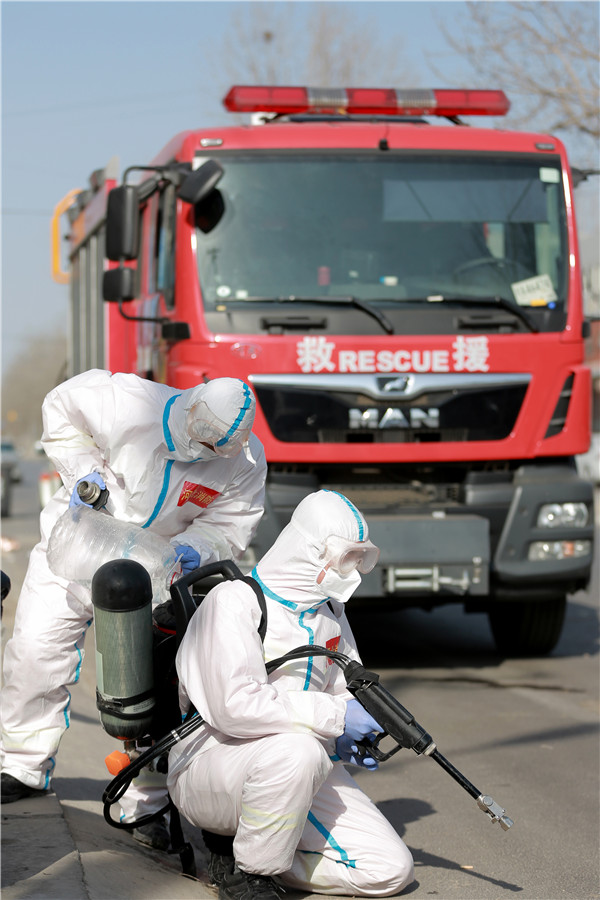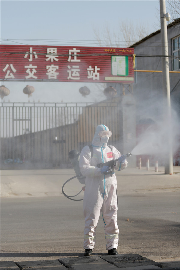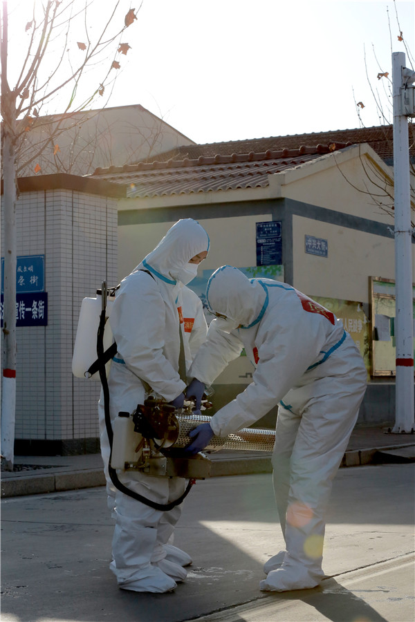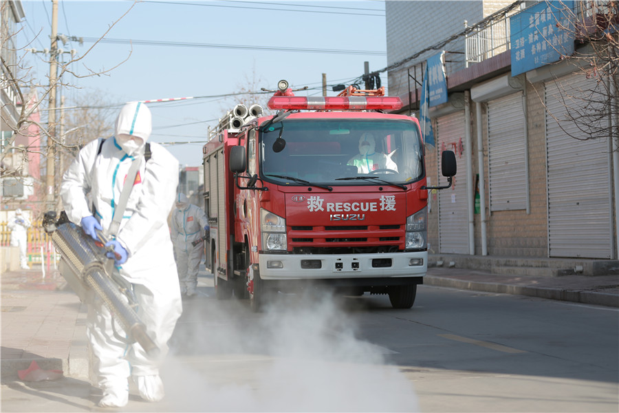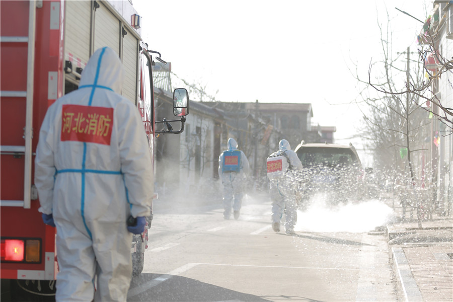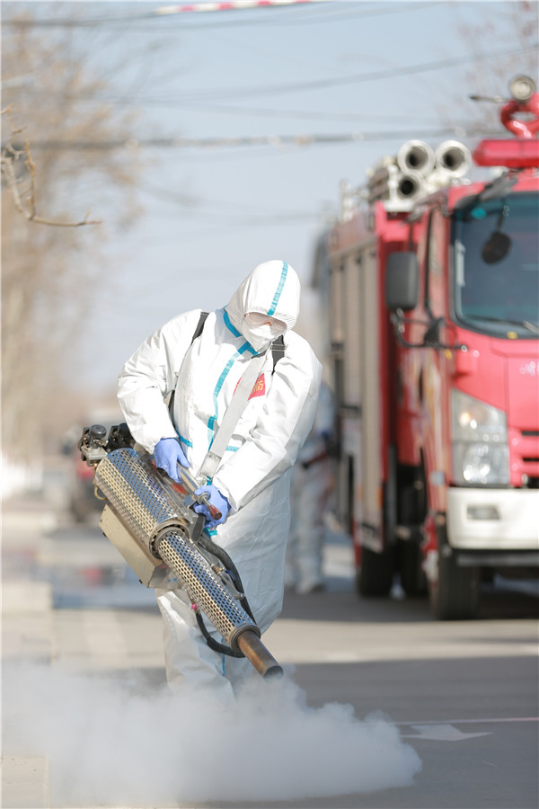 石家莊市消防救援支隊(duì)藁城大隊(duì)隊(duì)員兩人一組在石家莊市藁城區(qū)小果莊村執(zhí)行消殺任務(wù)(央廣網(wǎng)發(fā) 劉振洋 攝)