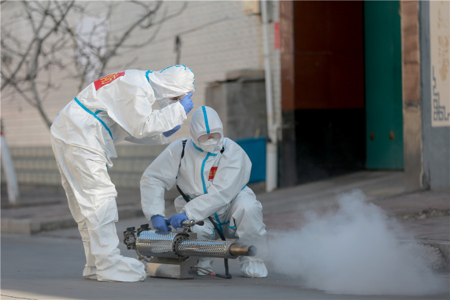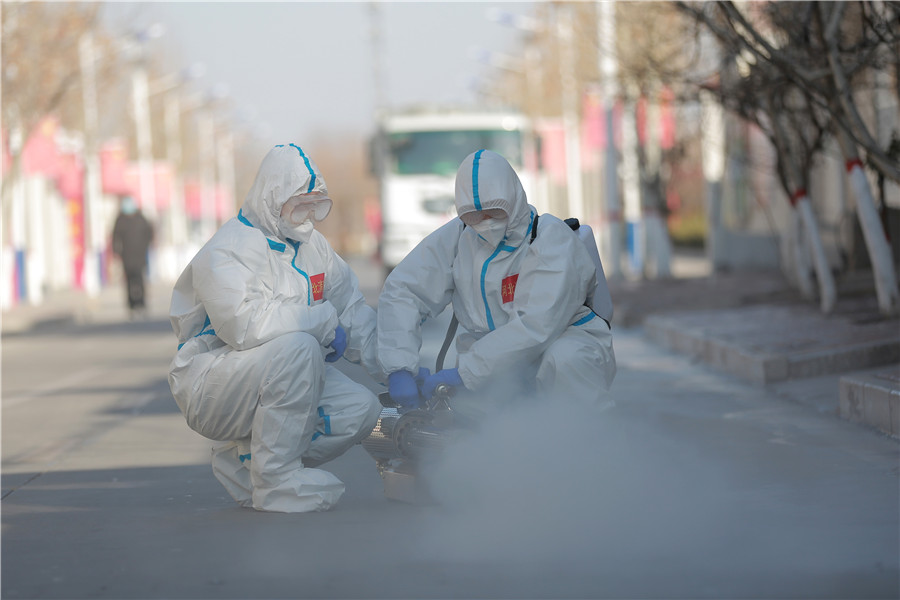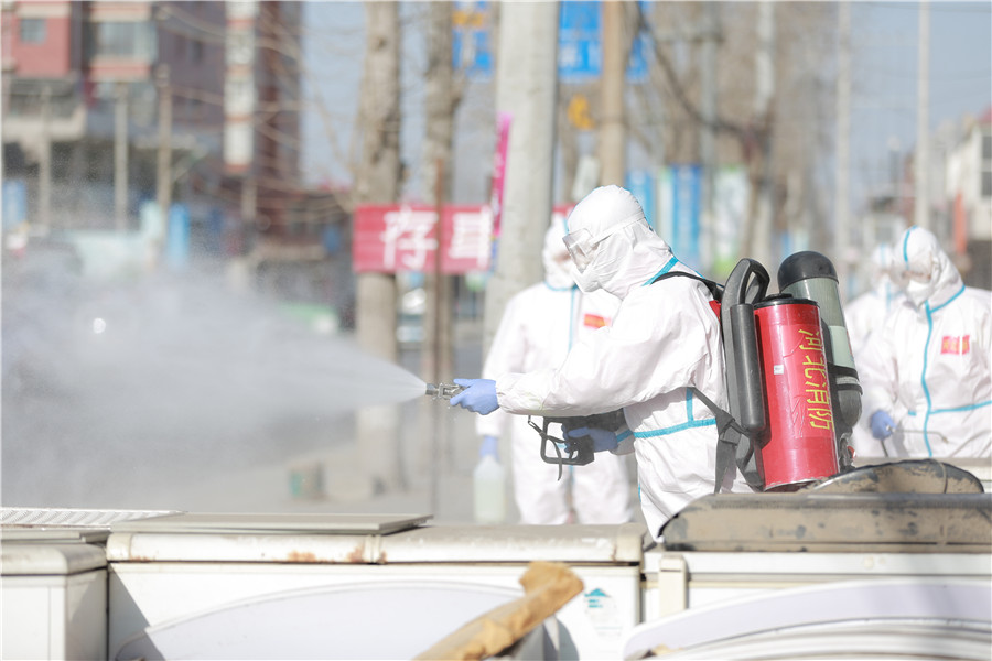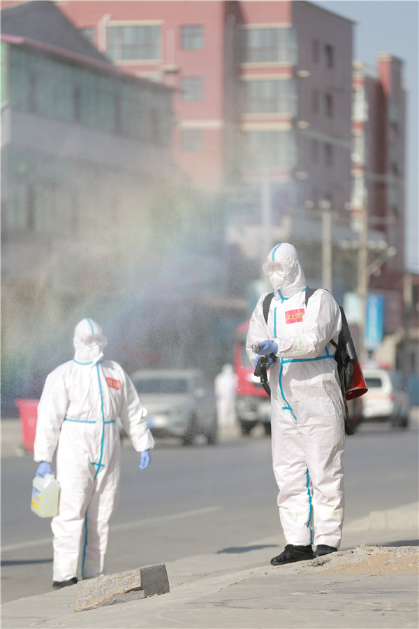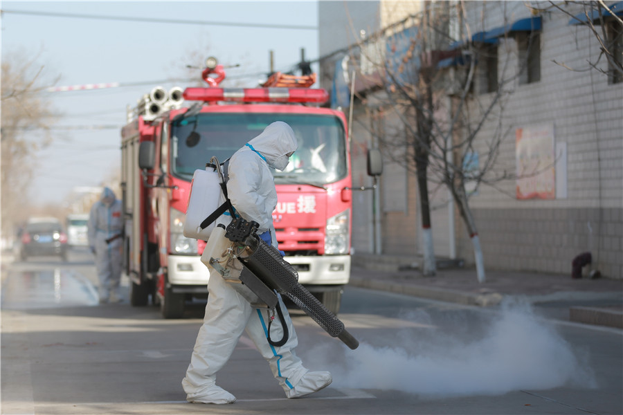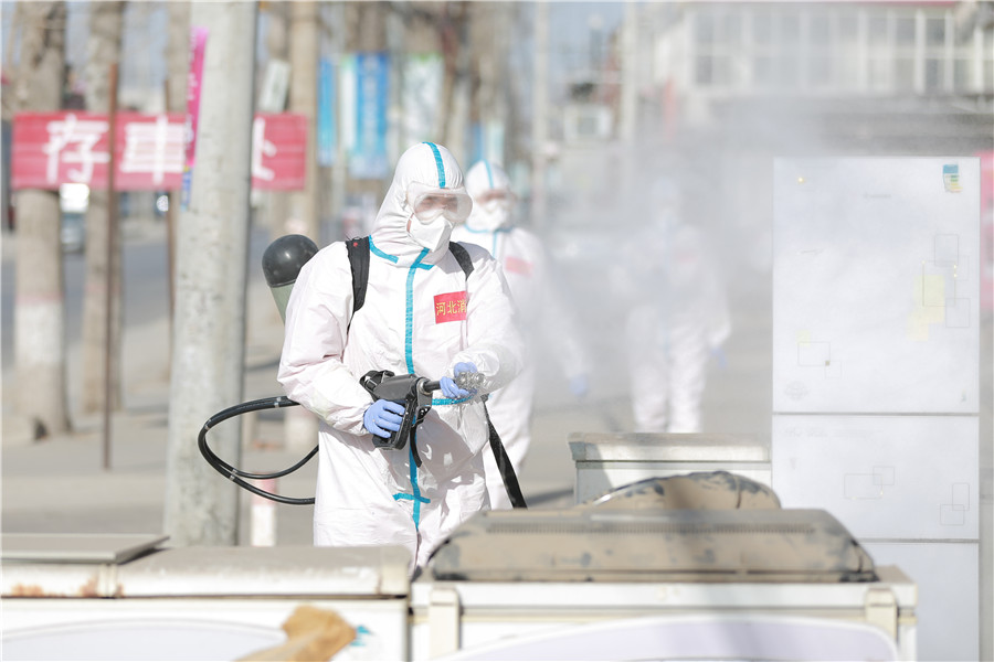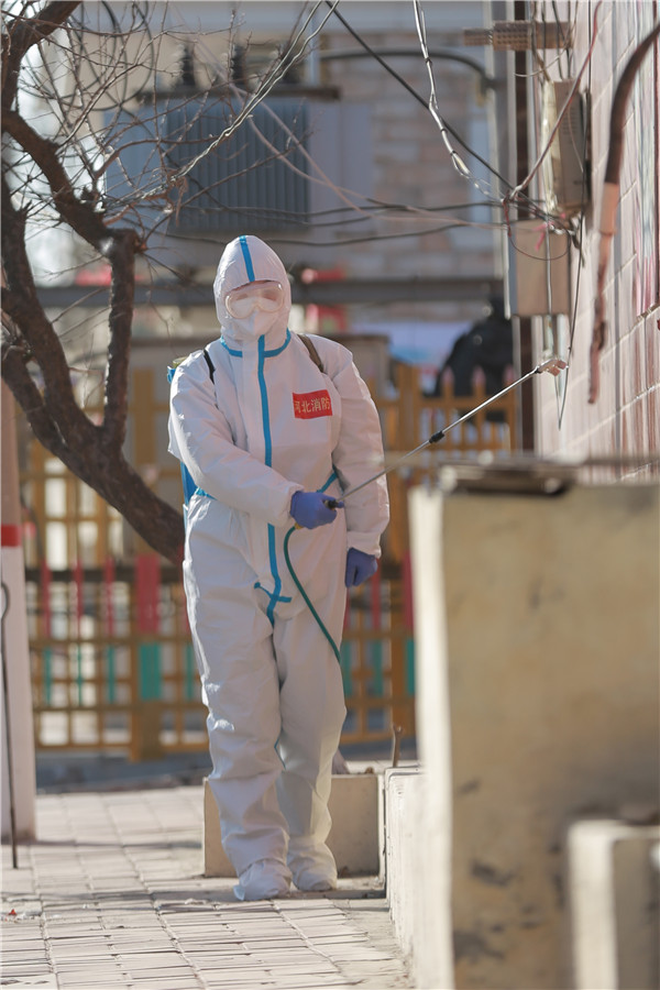 石家莊市消防救援支隊(duì)藁城大隊(duì)隊(duì)員兩人一組在石家莊市藁城區(qū)小果莊村執(zhí)行消殺任務(wù)(央廣網(wǎng)發(fā) 劉振洋 攝)