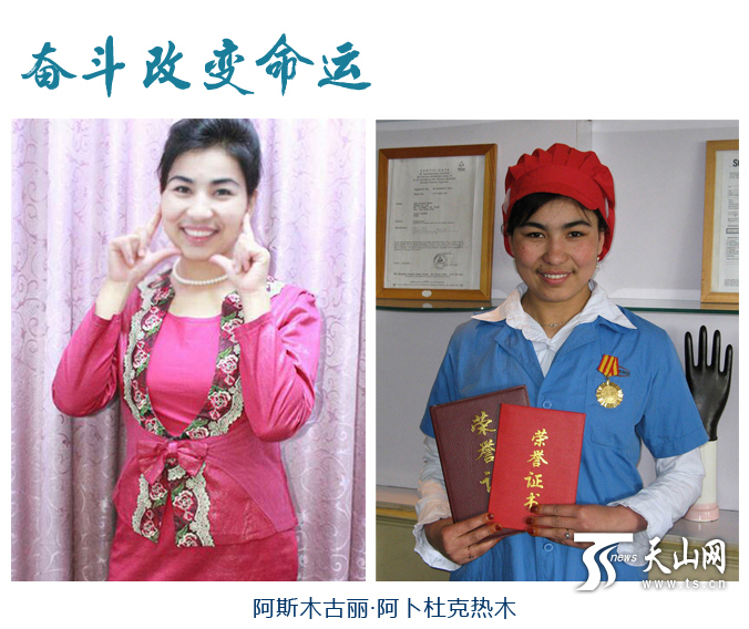 她是疏附縣烏帕爾鄉(xiāng)百西瓦村一個(gè)普通農(nóng)民, 2007年第一次隨鄉(xiāng)里組織前往天津蘭奇手套廠務(wù)工,剛進(jìn)蘭奇公司時(shí),語(yǔ)言不通、技能不熟,困難重重。阿斯木古麗從最基礎(chǔ)的日常用語(yǔ)學(xué)起,日夜苦練。一個(gè)月后,她已經(jīng)能用漢語(yǔ)和班組組長(zhǎng)進(jìn)行基礎(chǔ)對(duì)話了,。經(jīng)過(guò)幾個(gè)月的刻苦努力,她高標(biāo)準(zhǔn)地掌握了公司的脫膜包裝業(yè)務(wù),先后被破格提拔為烘箱員、品質(zhì)檢驗(yàn)員、班組長(zhǎng),她所帶的班組總能超額完成生產(chǎn)任務(wù)。2007年,阿斯木古麗被評(píng)為天津市勞動(dòng)模范。2011年,阿斯木古麗走進(jìn)了中國(guó)勞動(dòng)學(xué)院深造。