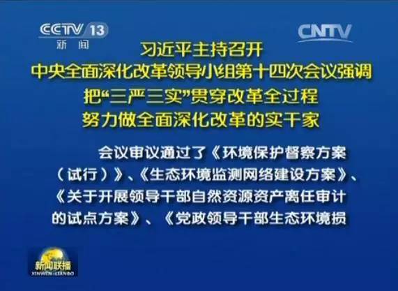 會(huì)議審議通過了《環(huán)境保護(hù)督察方案(試行)》、《生態(tài)環(huán)境監(jiān)測網(wǎng)絡(luò)建設(shè)方案》、《關(guān)于開展領(lǐng)導(dǎo)干部自然資源資產(chǎn)離任審計(jì)的試點(diǎn)方案》、《黨政領(lǐng)導(dǎo)干部生態(tài)環(huán)境損害責(zé)任追究辦法(試行)》、《關(guān)于推動(dòng)國有文化企業(yè)把社會(huì)效益放在首位、實(shí)現(xiàn)社會(huì)效益和經(jīng)濟(jì)效益相統(tǒng)一的指導(dǎo)意見》。