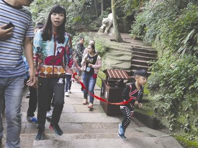 2015年10月1日四川樂山大佛景區(qū)。圖為來自寧夏的張女士在游覽樂山大佛景區(qū)時用紅絲帶綁著兒子的手以防人多走失。(記者 王紅強 )