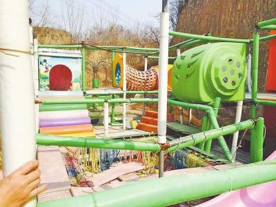 接到讀者報(bào)料后,記者當(dāng)天上午就找到了蝴蝶谷體育公園。它位于鄭州尖崗水庫(kù)西側(cè)金蝶路旁,與婁河村毗鄰。記者在現(xiàn)場(chǎng)看到,公園門(mén)前的那條路上堆積著大量建筑垃圾,而門(mén)口修建的停車場(chǎng),亦被黃土覆蓋。再往里走,內(nèi)設(shè)兒童滑梯已經(jīng)塌了,板凳馬、推鐵環(huán)、旱龍舟、風(fēng)火輪,趣味擂臺(tái)等場(chǎng)地設(shè)施,不是荒廢便是破成一堆,鐵欄桿上銹跡斑斑。