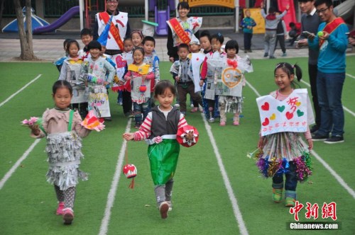 資料圖:2014年10月30日,山東聊城大學(xué)大學(xué)生在附屬幼兒園開展了“勤節(jié)約、點滴起”兒童環(huán)保時裝秀活動。中新社發(fā) 趙玉國 攝
